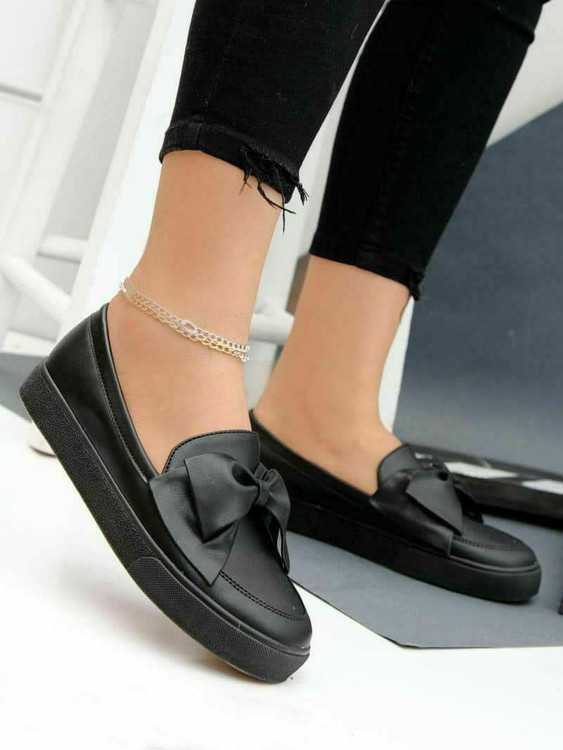 کالج عروسکی چرم پاپیونی زنانه ، دو رنگ مشکی و سفید، جنس چرم مصنوعی، قالب استاندارد، زیره نرم و راحت ، مناسب استفاده روزمره و مهمونی